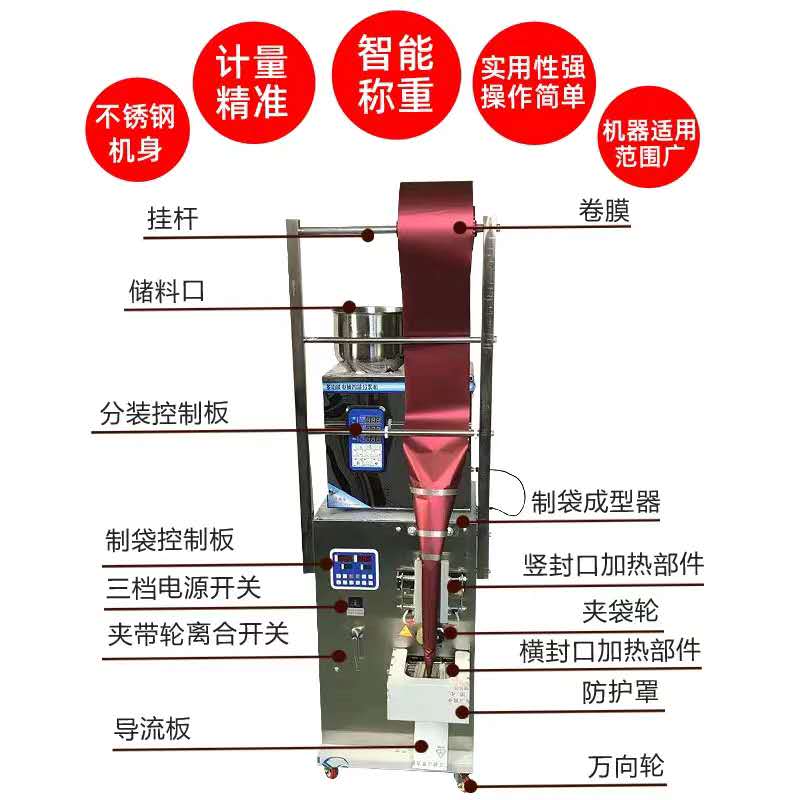 包裝機(jī)采用國內(nèi)先進(jìn)高智能微電腦控制技術(shù),是我司新款研發(fā)生產(chǎn)的小型全自動包裝機(jī)械設(shè)備,包裝美觀,精度高速度快。適合食品、醫(yī)藥、化工產(chǎn)品中的松散、無粘性細(xì)小顆粒狀、物料的自動包裝,如干燥劑、味精、洗衣粉、茶葉、白糖、食鹽、種子、咖啡、飲料、沖劑、麥片等。